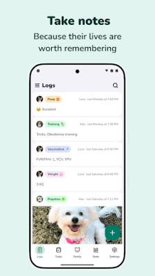 Each activity may come with pre-populated options, allowing you to easily track things such as pee/poop accidents, type of grooming or vaccination done, etc. Add your own notes anytime.