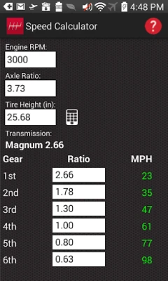 • Vehicle Speed Calculator: Interactively determine your vehicle’s speed in any gear and any engine RPM for best performance. You can alter the axle gear ratio, the transmission gear ratio and tire size to see the impact in real-time. As an added bonus, the calculator doubles as a Gear Ratio Calculator.