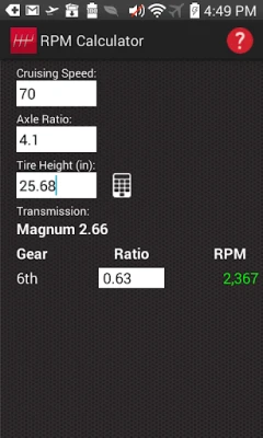• RPM Calculator: Determine what RPM your engine will run based on gear ratio, tire size, transmission and MPH. Try various combinations to come up with the best combination of gear ratio and tire size for your vehicle.
